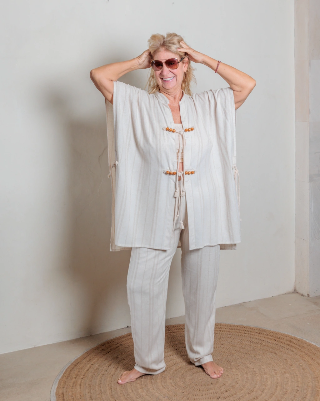 Pandawan by Marie Noelle, a lightweight unisex style tunic perfect for all seasons. Featuring handcrafted stone beads woven onto 70% Organic Linen / 30% Rayon Blend fabric. A versatile design for everyone.